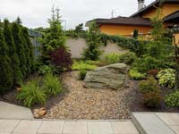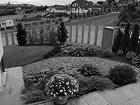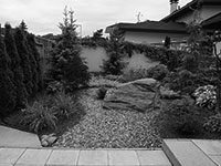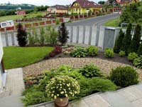 Zahrada ve svahu u moderního domu, byl částečně založená, vstupní část nebyl a osázená vůbec. Střídmá barevnost je oživena pouze červenohnědými listy kompaktních javorů a nízké dlužichy.Ke stávajícím růžím bylo doplňěna levandule, jejíž barva květu ladí se šedomodrou fasádou domu.